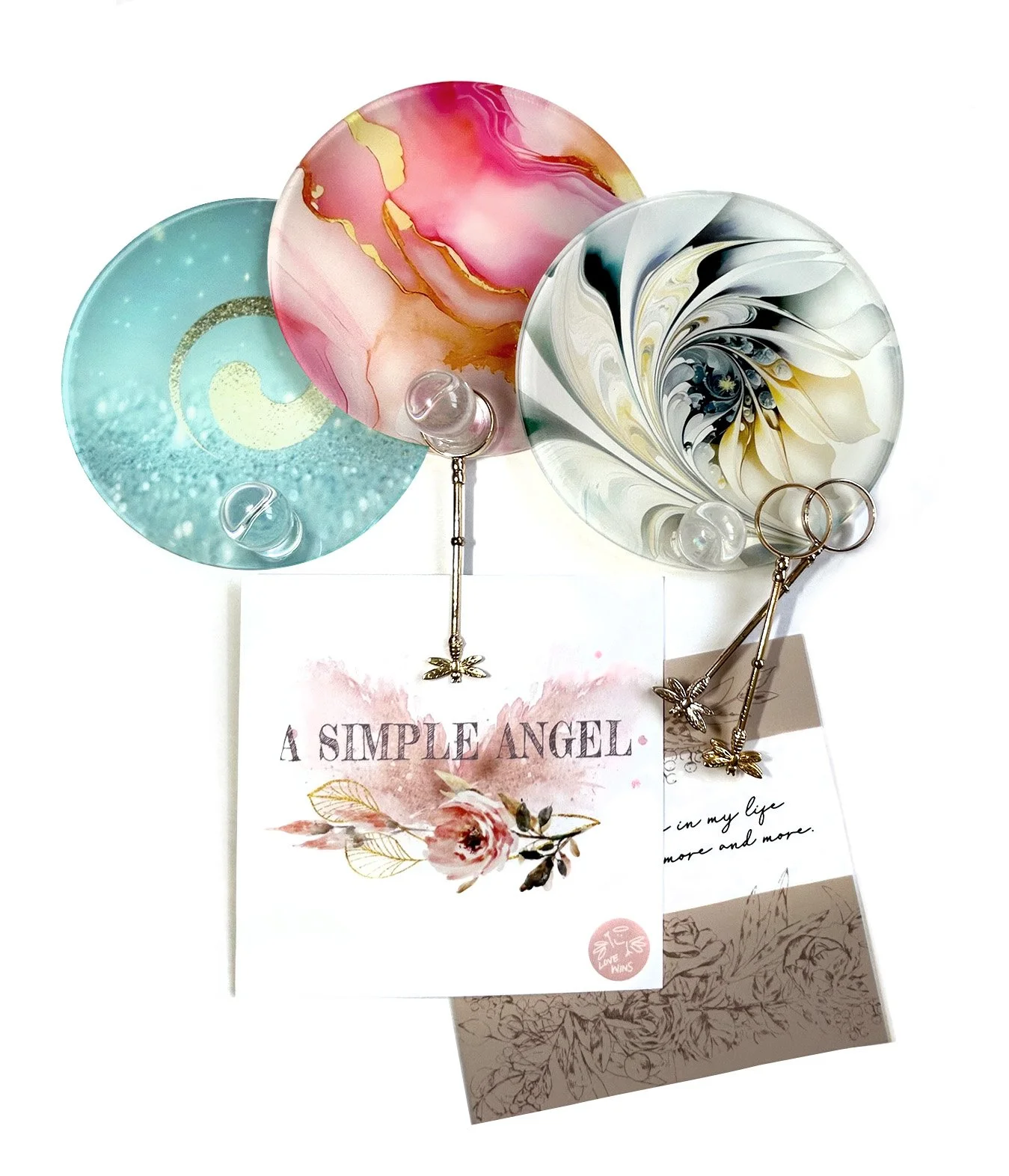 A Simple Angel Collection: One Pink Love Disk self-adhesive wall hanger, one gold dragonfly clip, and 20 inspiration cards.